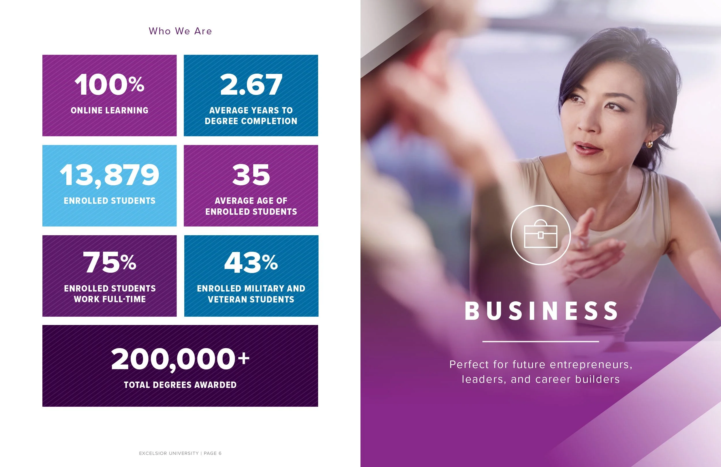 The goal of this viewbook is to give a quick overview of who Excelsior is and what programs are offered. A QR code was added to get prospective students to their preferred program’s landing page to get more detailed info, while also providing tracking info.