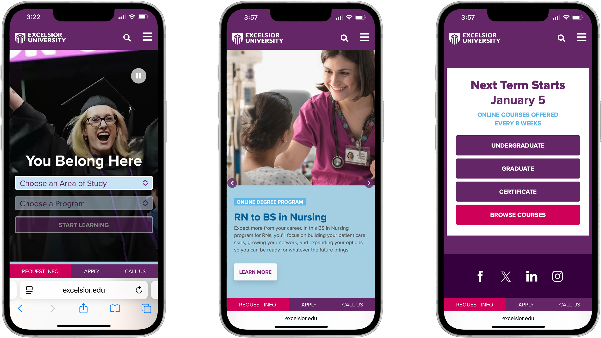 Featuring a background video that gives a sampling of the Excelsior experience, the homepage is designed to get prospective students to their program page of choice quickly with a degree program drop down menu.